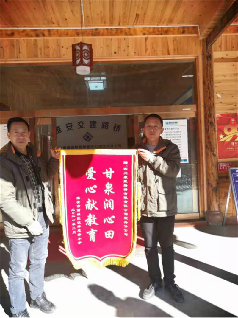 2月19日,雅安市雨城區(qū)第四小學漢碑校區(qū)將一面繡有“甘泉潤心田、愛心獻教育 ”的錦旗送到交建路橋公司寶興項目部,感謝路橋公司向漢碑校區(qū)捐贈5萬元基金用以建設該校勞動教育烹飪基地。