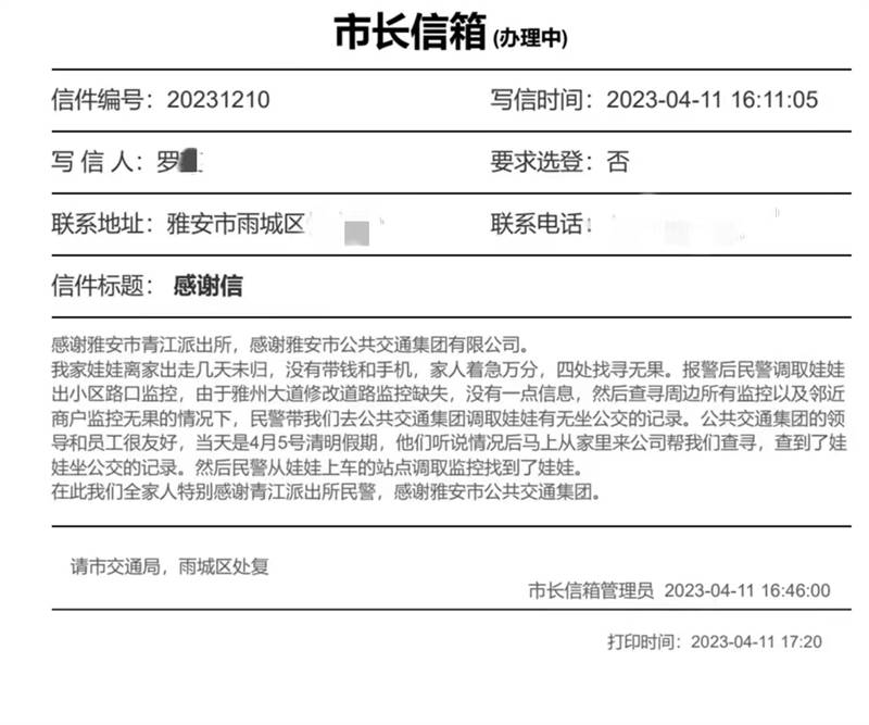 日前,市民羅女士的孩子離家出走,四處尋找無(wú)果。4月5日,時(shí)值清明假期,羅女士來(lái)到公交集團(tuán),希望工作人員幫忙查詢孩子乘坐公交車的記錄。得知情況后,公交集團(tuán)值班人員立即通知相關(guān)技術(shù)人員到崗到位,根據(jù)羅女士提供的戶口簿信息,通過(guò)后臺(tái)查詢到孩子使用學(xué)生卡在市區(qū)乘坐公交車的記錄及相關(guān)車輛的監(jiān)控視頻,并會(huì)同公安干警完整梳理出孩子的活動(dòng)軌跡,不到半個(gè)小時(shí),成功協(xié)助家長(zhǎng)找到離家出走的孩子。事后羅女士帶著感恩之情和禮物,專程到公交集團(tuán)表示感謝,公交集團(tuán)工作人員婉言謝絕了羅女士的禮物。隨后,羅女士在市長(zhǎng)信箱寫下了這封誠(chéng)摯的感謝信。