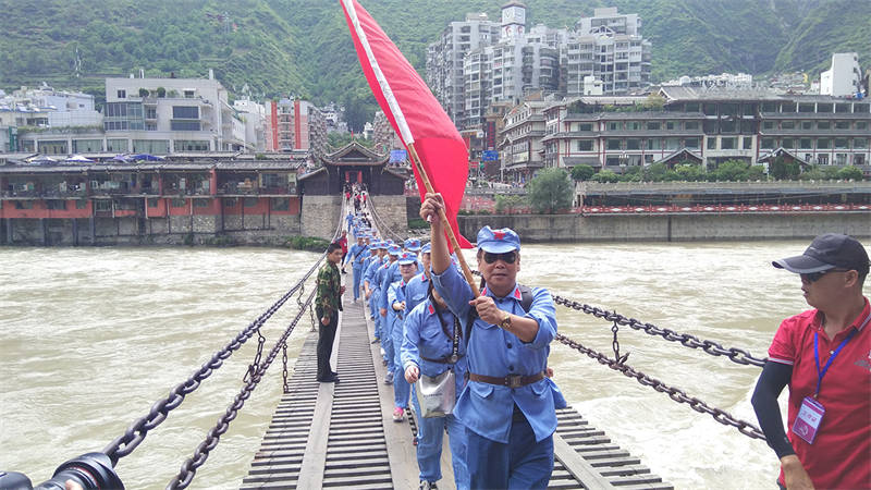 活動(dòng)中,全體黨員干部職工換上紅軍服、戴上紅軍帽,走上瀘定橋,觸摸著沾染了無(wú)數(shù)革命烈士鮮血的鐵索,瞬間將大家的思緒拉回到1935年的5月29日,22名勇士冒著敵人的槍林彈雨,攀著鐵鏈沖向?qū)Π叮⒂聤Z下瀘定橋,取得長(zhǎng)征中的一次決定性勝利場(chǎng)景。大家無(wú)不被革命先輩的英勇與無(wú)畏所震撼。