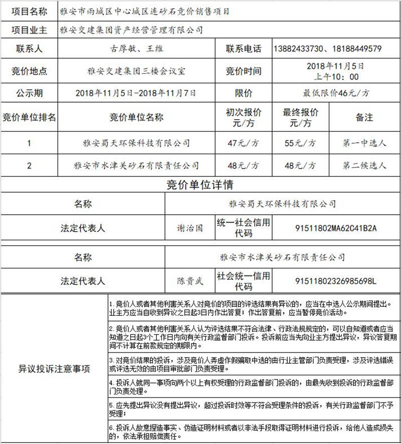 雅安交建集團(tuán)資產(chǎn)經(jīng)營(yíng)管理有限公司關(guān)于雅安市雨城區(qū)中心城區(qū)連砂石競(jìng)價(jià)銷售結(jié)果公示