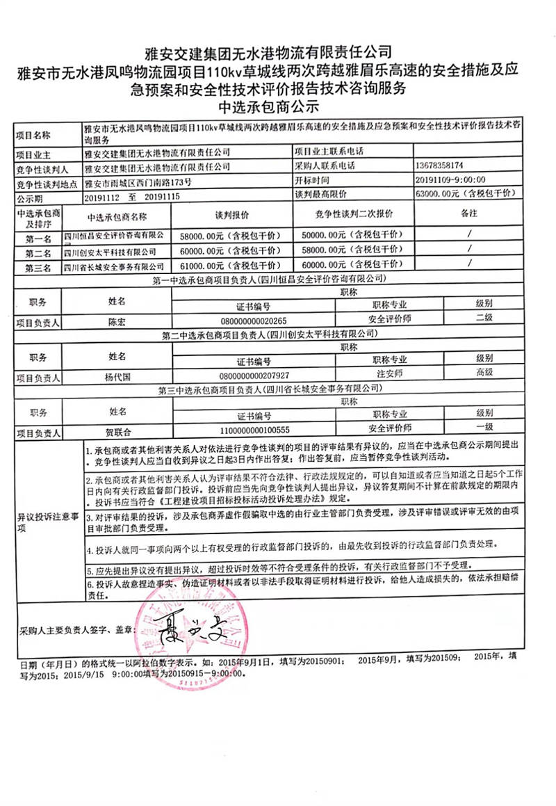 雅安交建集團(tuán)無水港物流有限責(zé)任公司雅安市無水港鳳鳴物流園項(xiàng)目110kv草城線兩次跨越雅眉樂高速的安全措施、應(yīng)急預(yù)案以及安全性技術(shù)評(píng)價(jià)報(bào)告技術(shù)咨詢服務(wù)中選承包商公示
