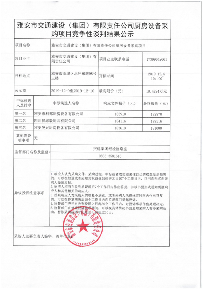雅安市交通建設(集團)有限責任公司廚房設備采購項目競爭性談判結(jié)果公示