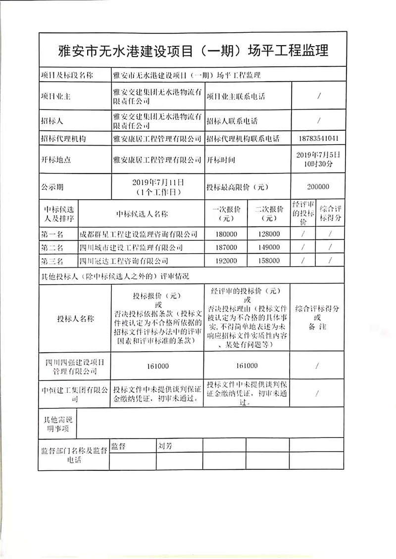 雅安交建集團(tuán)無水港物流有限責(zé)任公司雅安市無水港建設(shè)項(xiàng)目(一期)場(chǎng)平工程監(jiān)理競(jìng)爭(zhēng)性談判結(jié)果公示