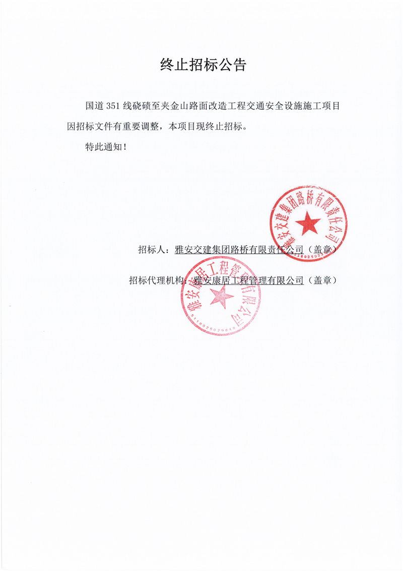 雅安交建集團(tuán)路橋有限責(zé)任公司國道351線磽磧至夾金山段路面改造工程交通安全設(shè)施施工項(xiàng)目終止招標(biāo)公告