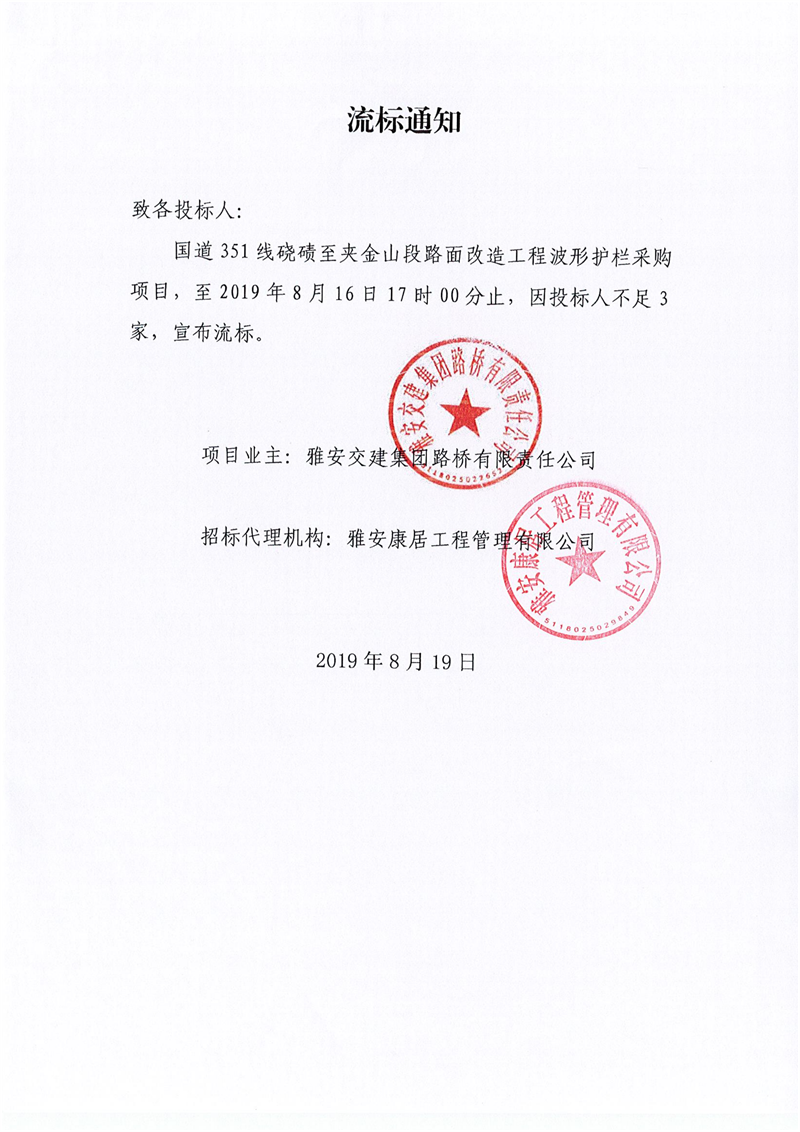 雅安交建集團(tuán)路橋有限責(zé)任公司國(guó)道351線磽磧至夾金山段路面改造工程波形護(hù)欄采購(gòu)項(xiàng)目流標(biāo)通知