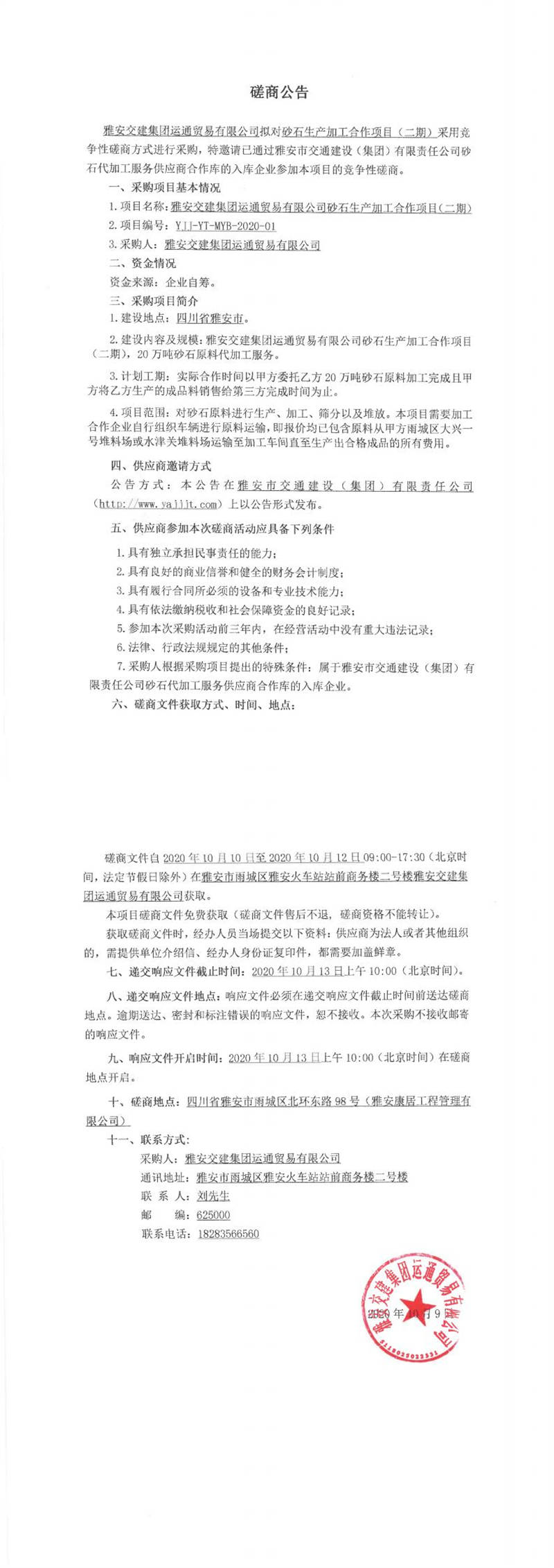雅安交建集團(tuán)運(yùn)通貿(mào)易有限公司砂石生產(chǎn)加工合作項(xiàng)目(二期)競(jìng)爭(zhēng)性磋商公告