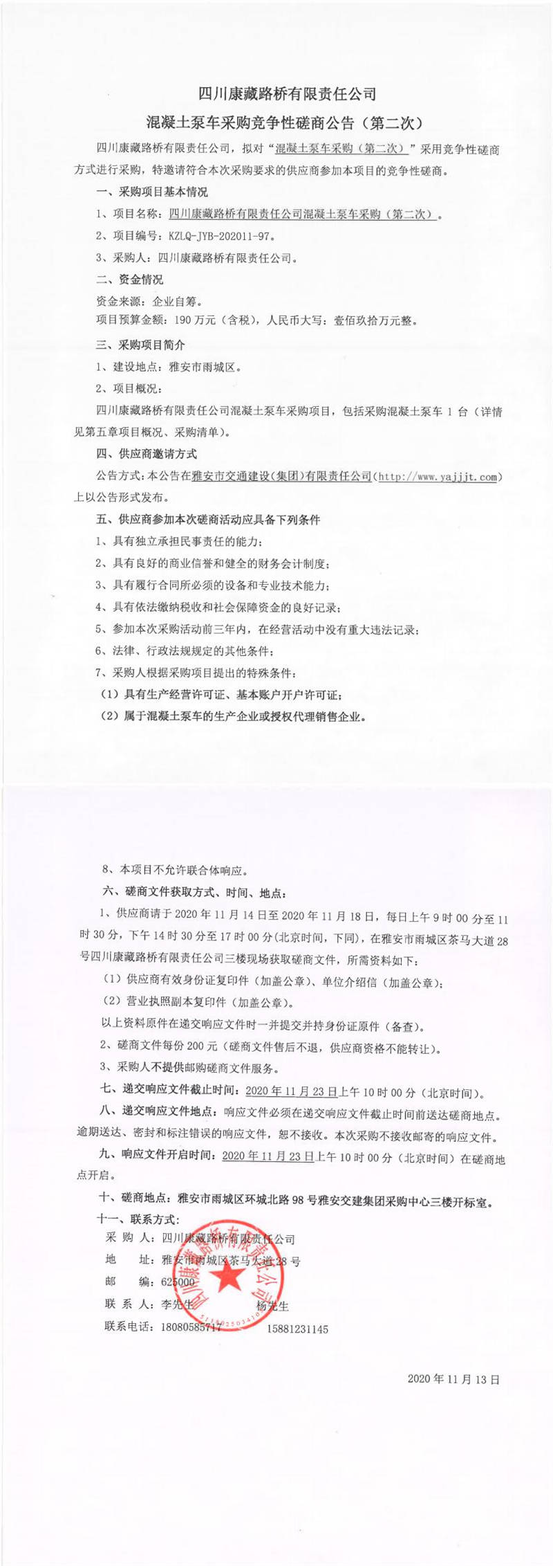 四川康藏路橋有限責(zé)任公司混凝土泵車采購競(jìng)爭(zhēng)性磋商公告(第二次)