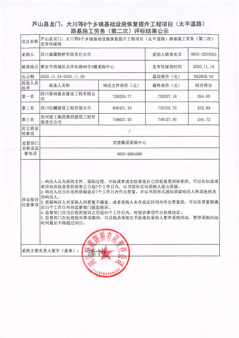 四川康藏路橋有限責任公司蘆山縣龍門、大川等8個鄉(xiāng)鎮(zhèn)基礎(chǔ)設施恢復提升工程項目(太平道路)路基施工勞務(第二次)評標結(jié)果公示