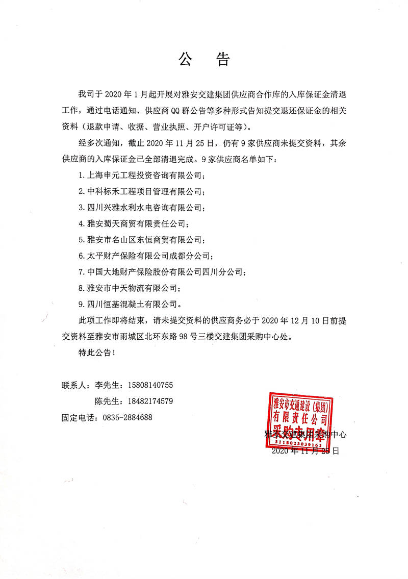 關(guān)于雅安交建集團(tuán)供應(yīng)商合作庫入庫保證金清退相關(guān)事宜的公告