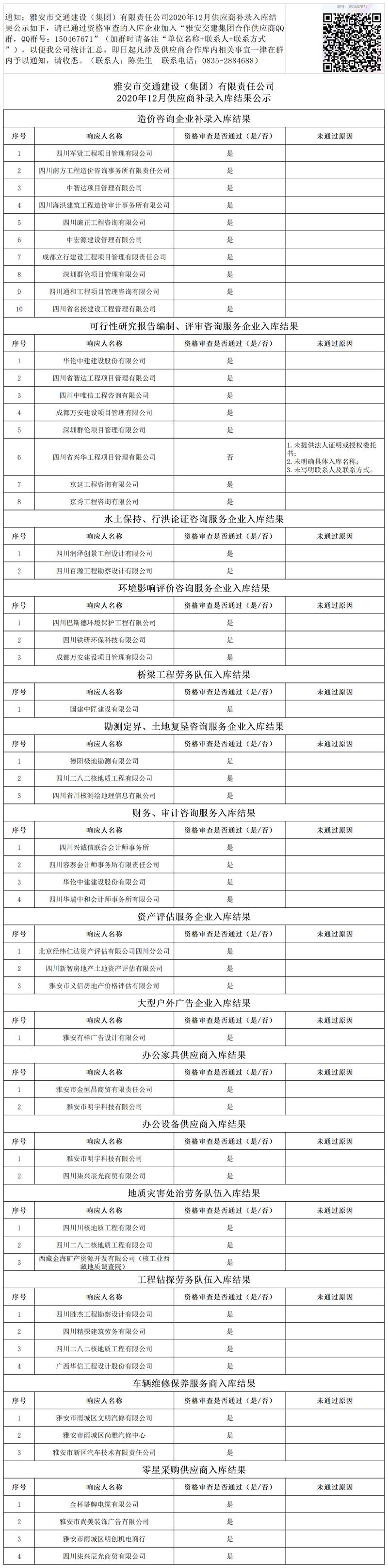 雅安市交通建設(shè)(集團)有限責任公司2020年12月供應商補錄入庫結(jié)果公示