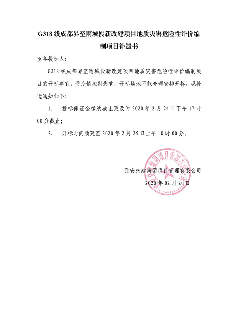雅安交建集團(tuán)項(xiàng)目管理有限公司G318線成都界至雨城段新改建項(xiàng)目地質(zhì)災(zāi)害危險(xiǎn)性評(píng)價(jià)編制項(xiàng)目補(bǔ)遺書