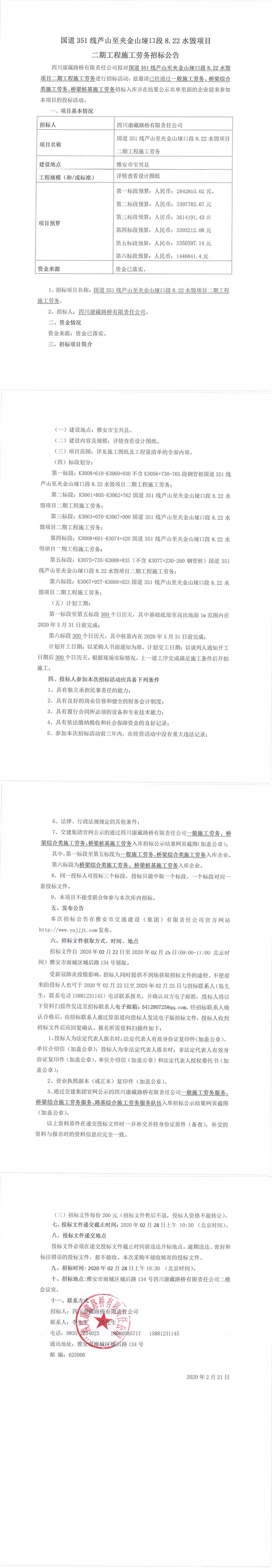 四川康藏路橋有限責(zé)任公司國(guó)道351線(xiàn)蘆山至夾金山埡口段8.22水毀項(xiàng)目二期工程施工勞務(wù)招標(biāo)公告