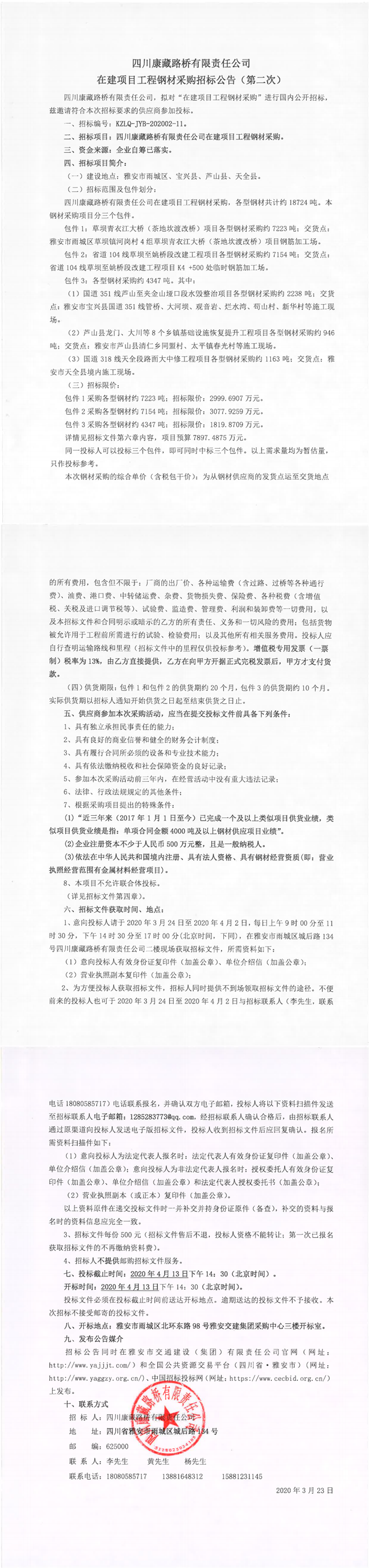四川康藏路橋有限責(zé)任公司在建項目工程鋼材采購招標(biāo)公告(第二次)