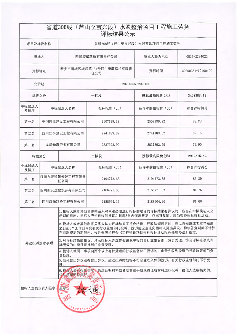 四川康藏路橋有限責(zé)任公司省道308線(蘆山至寶興段)水毀整治項(xiàng)目工程施工勞務(wù)評標(biāo)結(jié)果公示