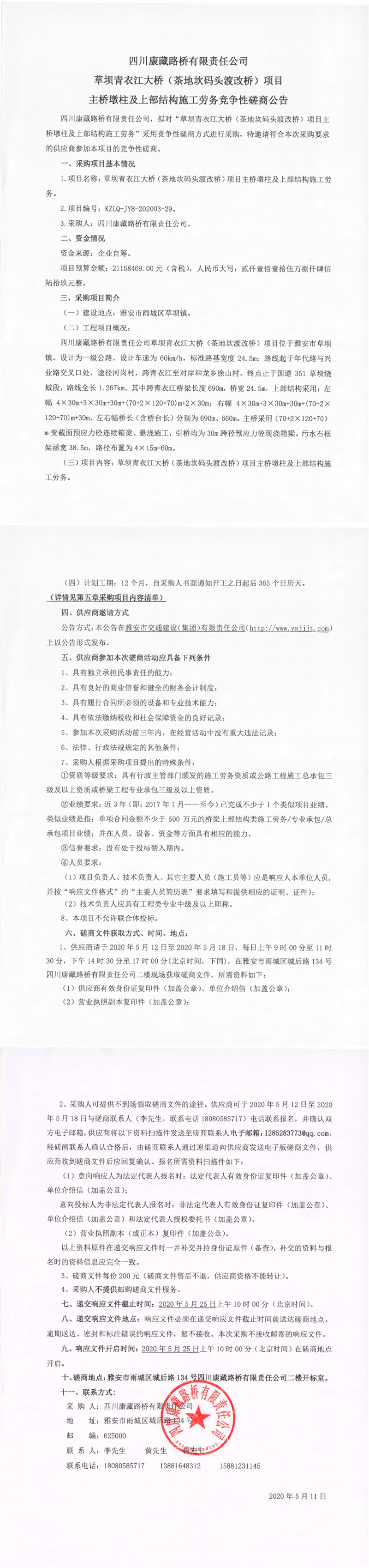 四川康藏路橋有限責(zé)任公司草壩青衣江大橋(茶地坎碼頭渡改橋)項目主橋墩柱及上部結(jié)構(gòu)施工勞務(wù)競爭性磋商公告
