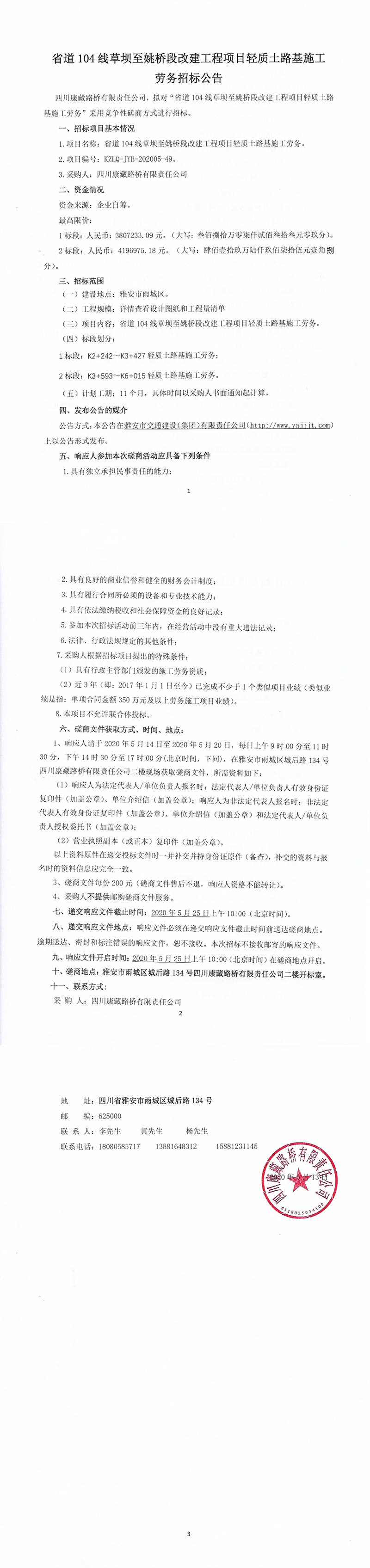 四川康藏路橋有限責(zé)任公司省道104線草壩至姚橋段改建項目輕質(zhì)土路基施工勞務(wù)招標(biāo)公告