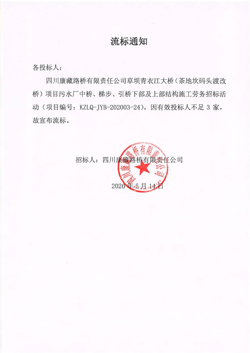 四川康藏路橋有限責任公司草壩青衣江大橋(茶地坎碼頭渡改橋)項目污水廠中橋、梯步、引橋下部及上部結構施工勞務流標通知