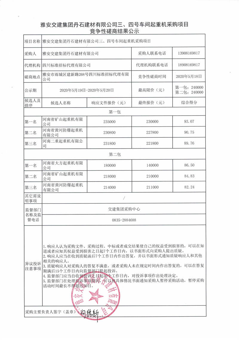 雅安交建集團(tuán)丹石建材有限公司三、四號車間起重機采購項目競爭性磋商結(jié)果公示