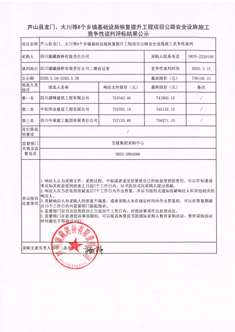 四川康藏路橋有限責(zé)任公司蘆山縣龍門、大川等8個鄉(xiāng)鎮(zhèn)基礎(chǔ)設(shè)施恢復(fù)提升工程項目公路安全設(shè)施施工競爭性談判評標(biāo)結(jié)果公示