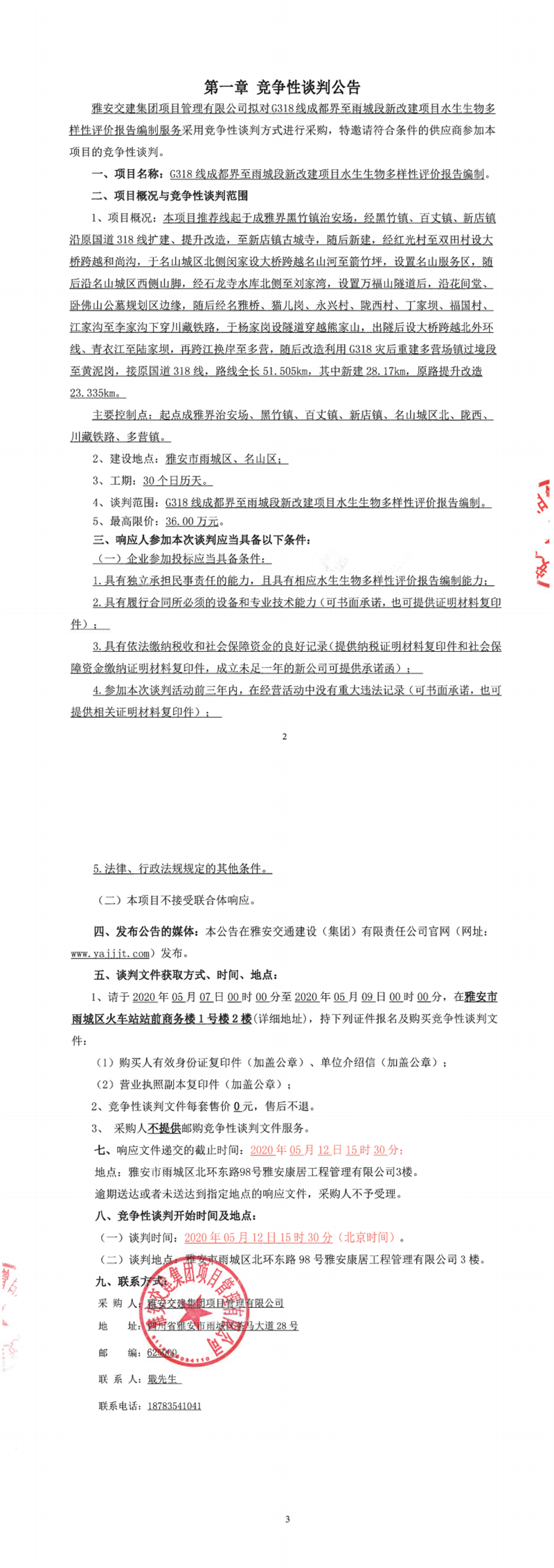 雅安交建集團(tuán)項(xiàng)目管理有限公司G318線成都界至雨城段新改建項(xiàng)目水生生物多樣性評(píng)價(jià)報(bào)告編制競爭性談判(第二次)公告