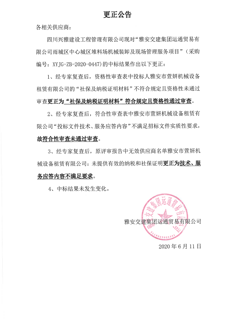 雅安交建集團運通貿(mào)易有限公司雨城區(qū)中心城區(qū)堆料場機械裝卸及現(xiàn)場管理服務(wù)項目更正公告