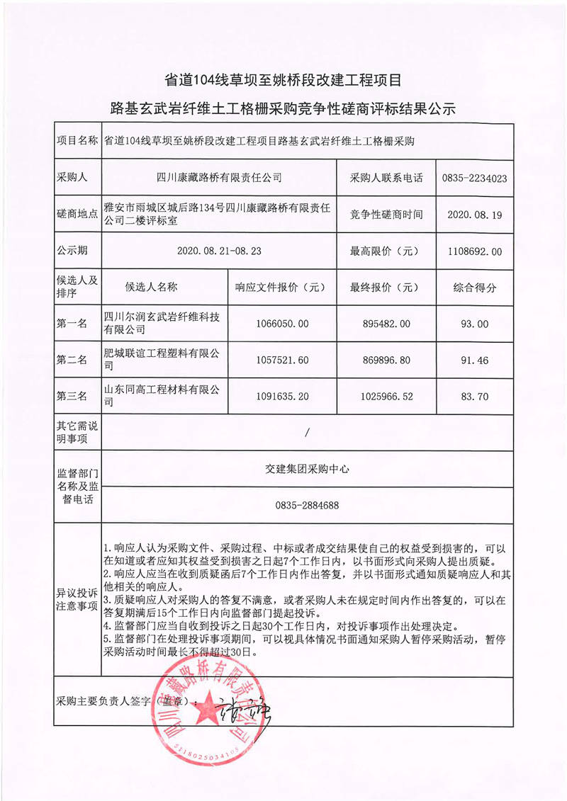 四川康藏路橋有限責(zé)任公司省道104線草壩至姚橋段改建工程項(xiàng)目路基玄武巖纖維土工格柵采購競爭性磋商評標(biāo)結(jié)果公示