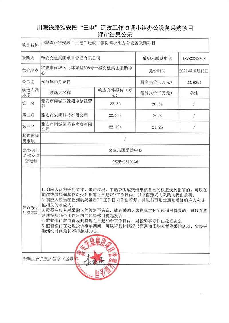 雅安交建集團(tuán)項(xiàng)目管理有限公司川藏鐵路雅安段“三電”遷改工作協(xié)調(diào)小組辦公設(shè)備采購項(xiàng)目評(píng)審結(jié)果公示