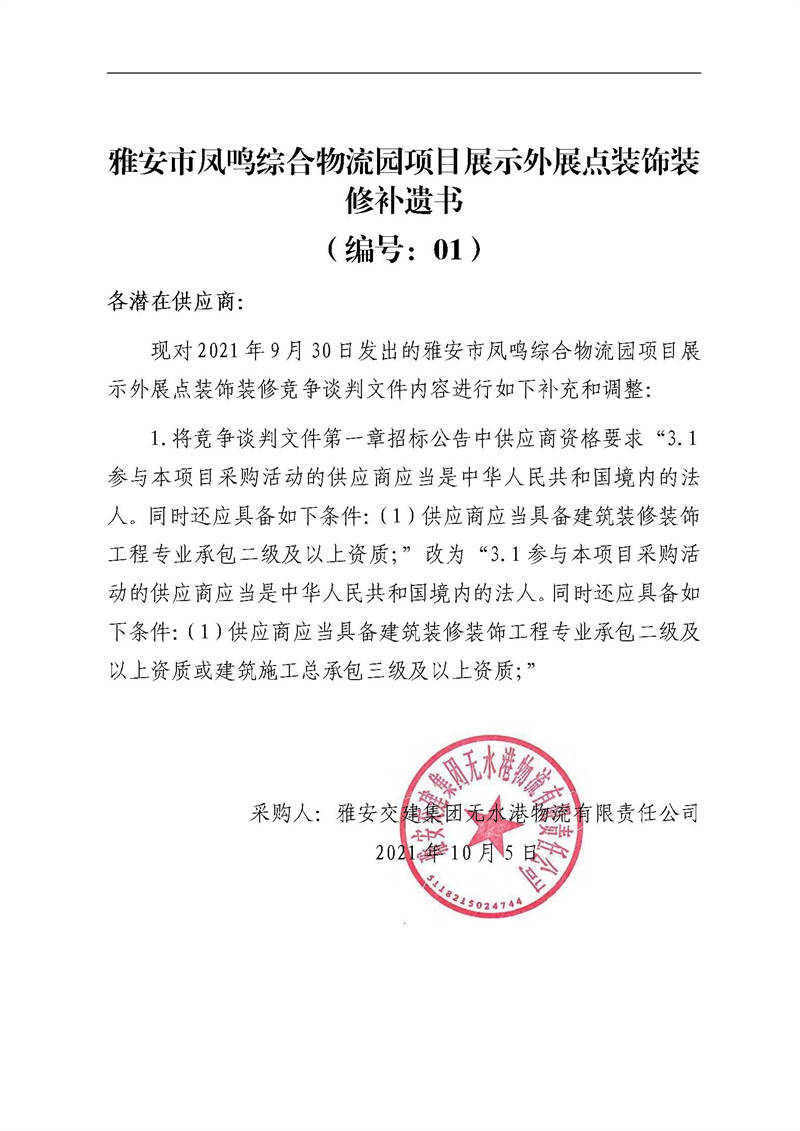 雅安交建集團無水港物流有限責(zé)任公司雅安市鳳鳴綜合物流園項目展示外展點裝飾裝修補遺書