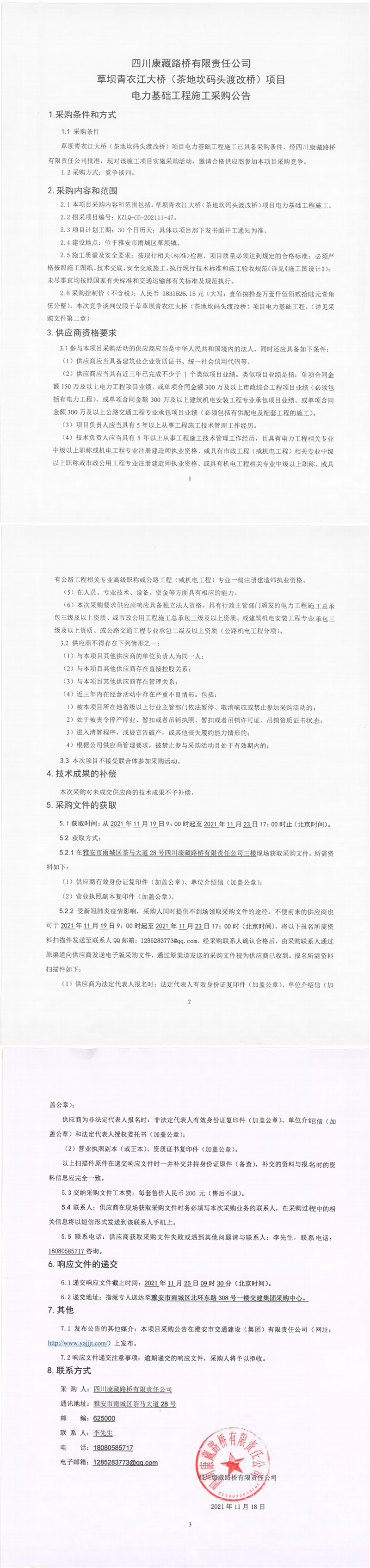 四川康藏路橋有限責任公司草壩青衣江大橋(茶地坎碼頭渡改橋)項目電力基礎(chǔ)工程施工采購公告