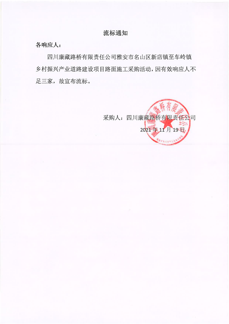 四川康藏路橋有限責(zé)任公司雅安市名山區(qū)新店鎮(zhèn)至車嶺鎮(zhèn)鄉(xiāng)村振興產(chǎn)業(yè)道路建設(shè)項(xiàng)目路面施工采購(gòu)流標(biāo)通知