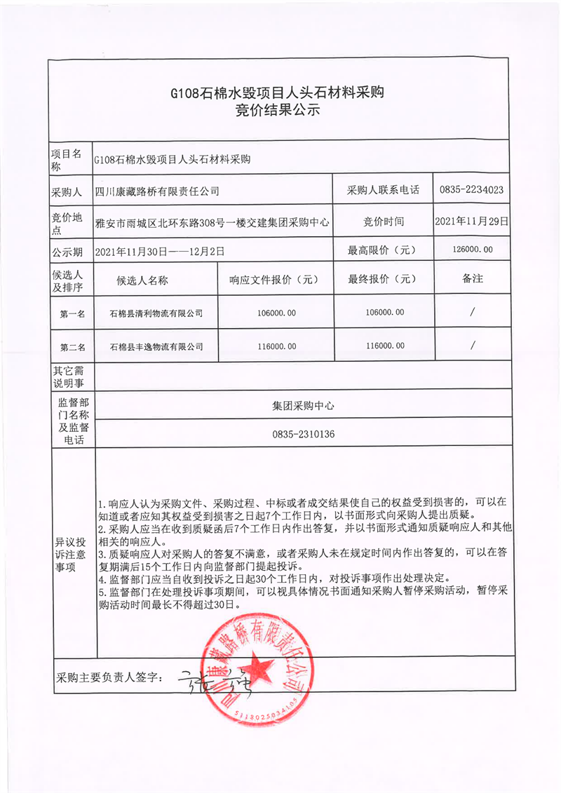 四川康藏路橋有限責(zé)任公司G108石棉水毀項(xiàng)目人頭石材料采購(gòu)競(jìng)價(jià)結(jié)果公示