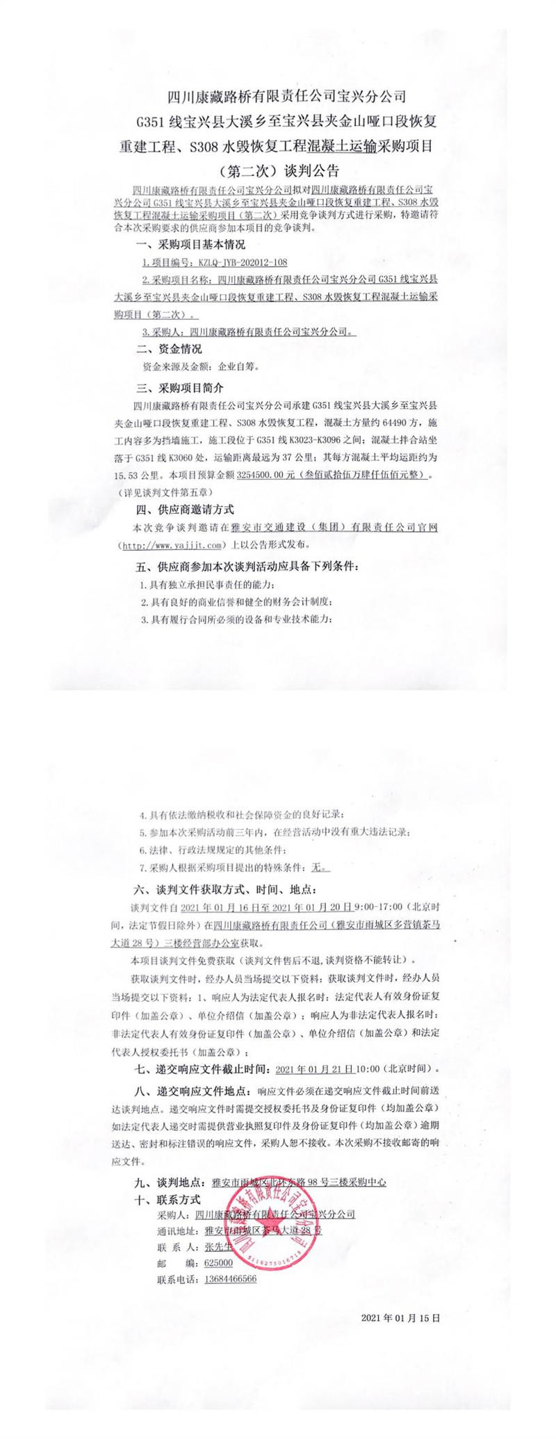 四川康藏路橋有限責(zé)任公司寶興分公司G351線寶興縣大溪鄉(xiāng)至寶興縣夾金山啞口段恢復(fù)重建工程、S308水毀恢復(fù)工程混凝土運(yùn)輸采購項(xiàng)目(第二次)談判公告