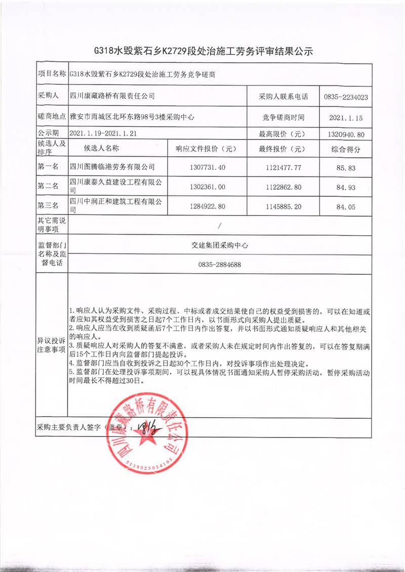 四川康藏路橋有限責任公司G318水毀紫石鄉(xiāng)K2729段處治施工勞務評審結果公示