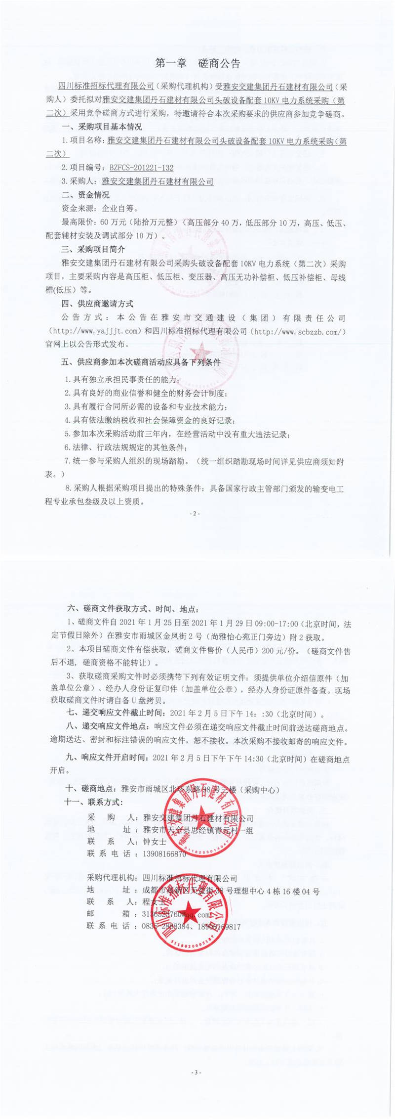 雅安交建集團(tuán)丹石建材有限公司頭破設(shè)備配套10KV電力系統(tǒng)采購(gòu)(第二次)競(jìng)爭(zhēng)磋商公告