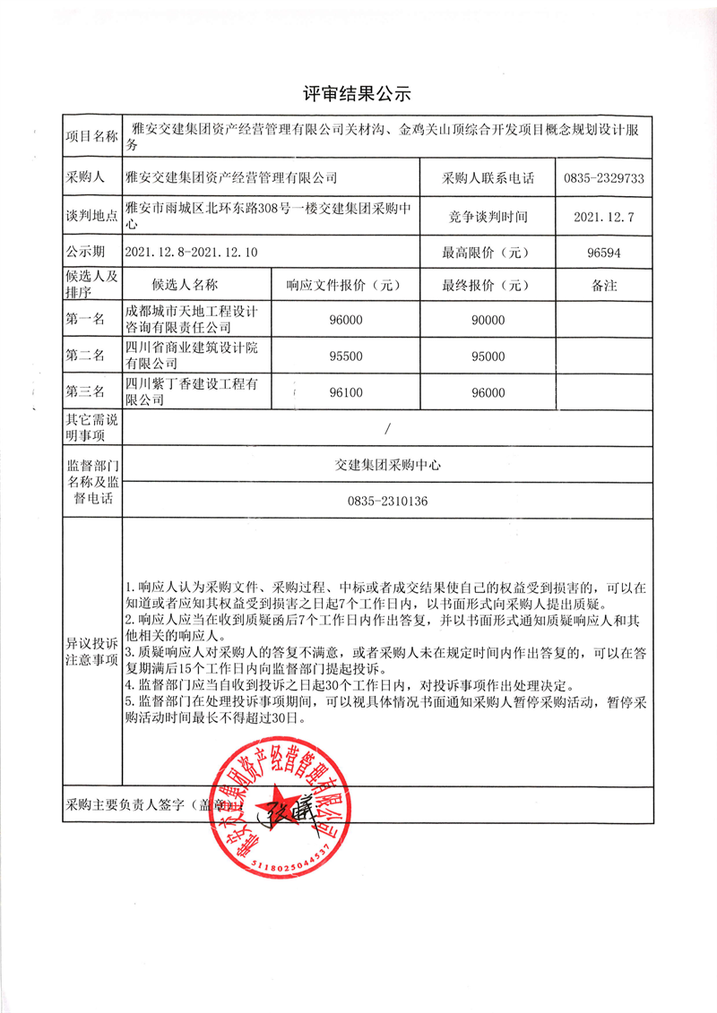雅安交建集團資產(chǎn)經(jīng)營管理有限公司關材溝、金雞關山頂綜合開發(fā)項目概念規(guī)劃設計服務評審結(jié)果公示