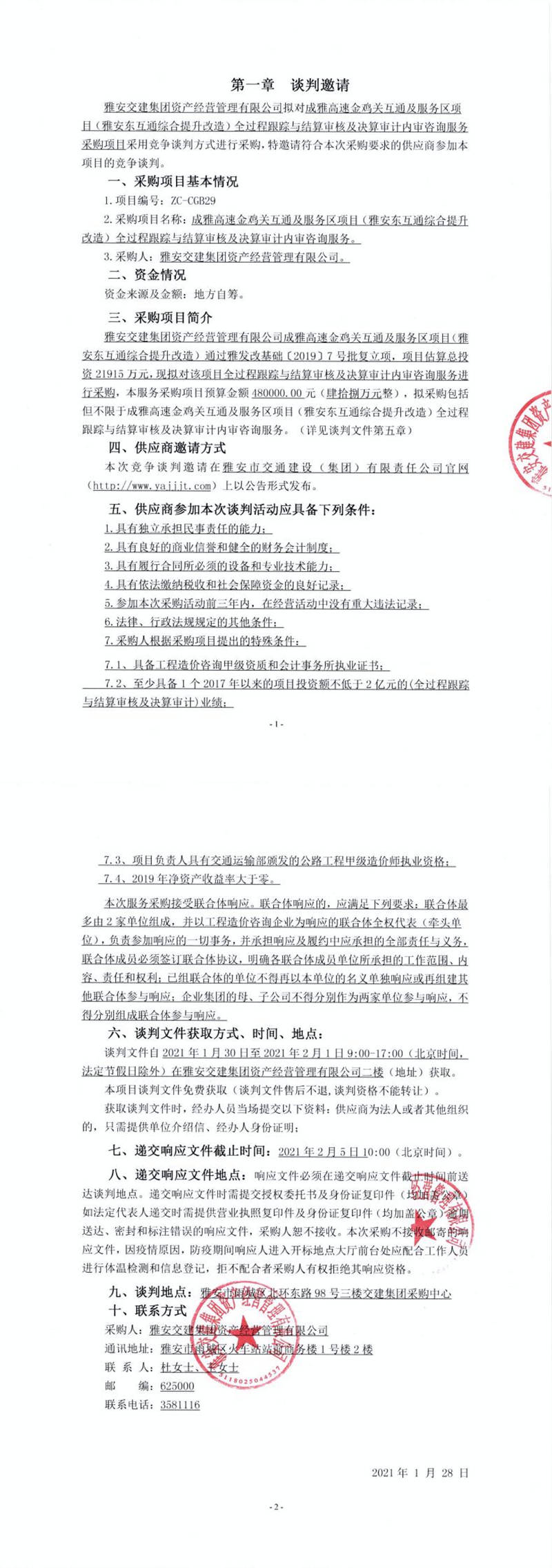 雅安交建集團(tuán)資產(chǎn)經(jīng)營(yíng)管理有限公司成雅高速金雞關(guān)互通及服務(wù)區(qū)項(xiàng)目(雅安東互通綜合提升改造)全過(guò)程跟蹤與結(jié)算審核及決算審計(jì)內(nèi)審咨詢(xún)服務(wù)談判公告