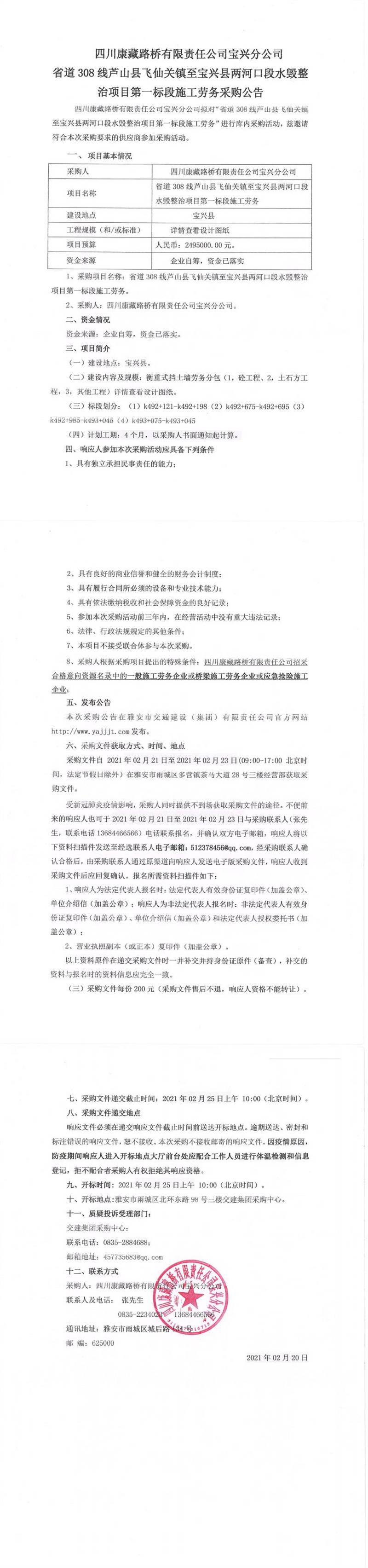 四川康藏路橋有限責(zé)任公司寶興分公司省道308線蘆山縣飛仙關(guān)鎮(zhèn)至寶興縣兩河口段水毀整治項(xiàng)目第一標(biāo)段施工勞務(wù)采購公告