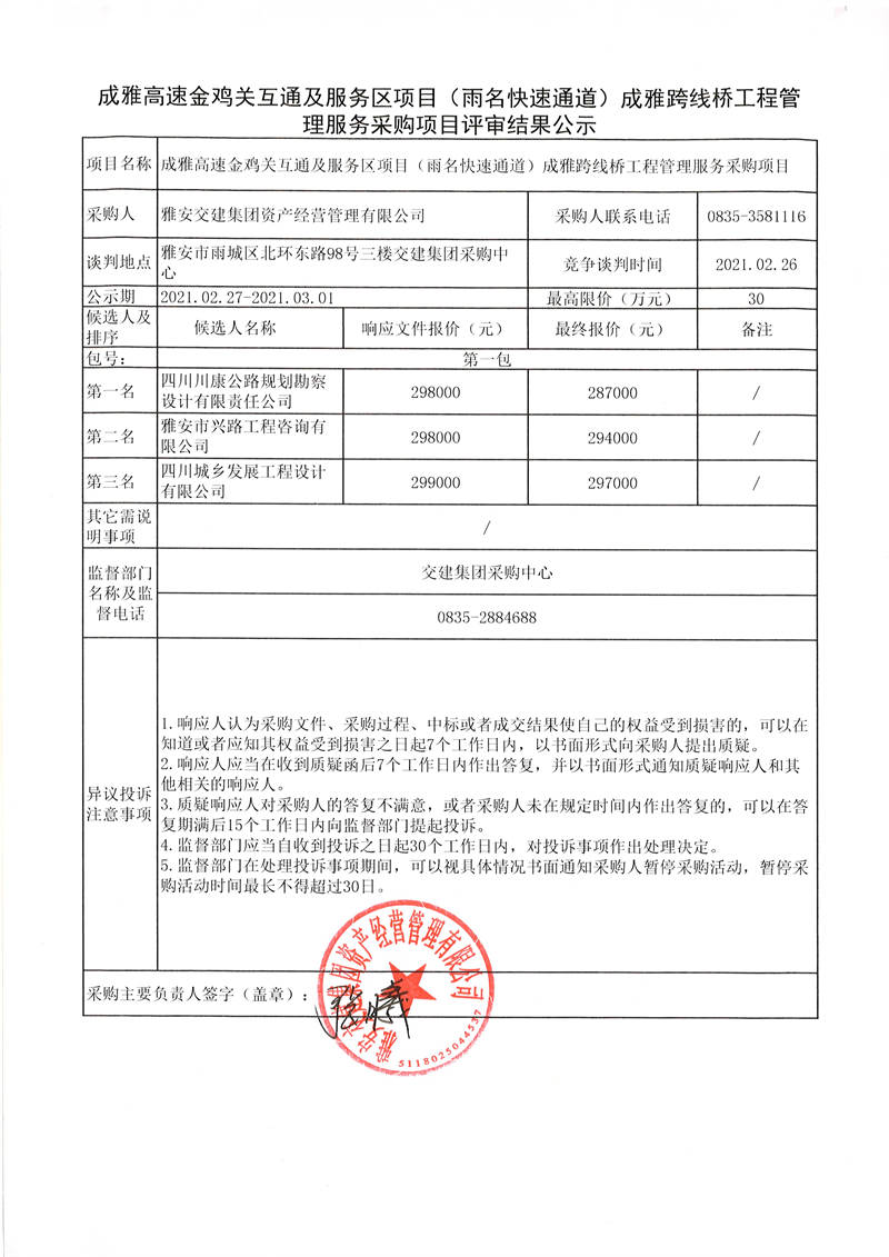 雅安交建集團資產經營管理有限公司成雅高速金雞關互通及服務區(qū)項目(雨名快速通道)成雅跨線橋工程管理服務采購項目評審結果公示