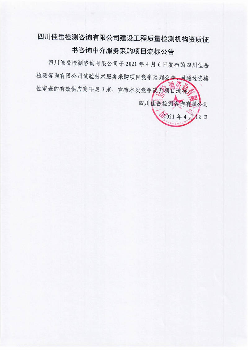四川佳岳檢測(cè)咨詢有限公司建設(shè)工程質(zhì)量檢測(cè)機(jī)構(gòu)資質(zhì)證書(shū)咨詢中介服務(wù)采購(gòu)項(xiàng)目流標(biāo)公告