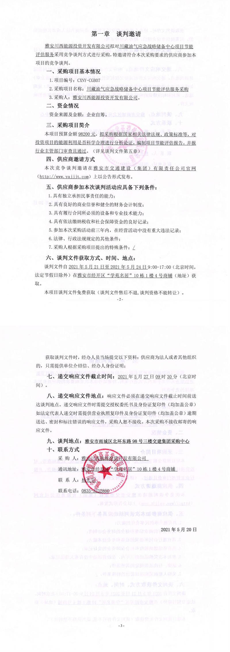 雅安川西能源投資開(kāi)發(fā)有限公司川藏油氣應(yīng)急戰(zhàn)略儲(chǔ)備中心項(xiàng)目節(jié)能評(píng)估服務(wù)采購(gòu)競(jìng)爭(zhēng)談判公告