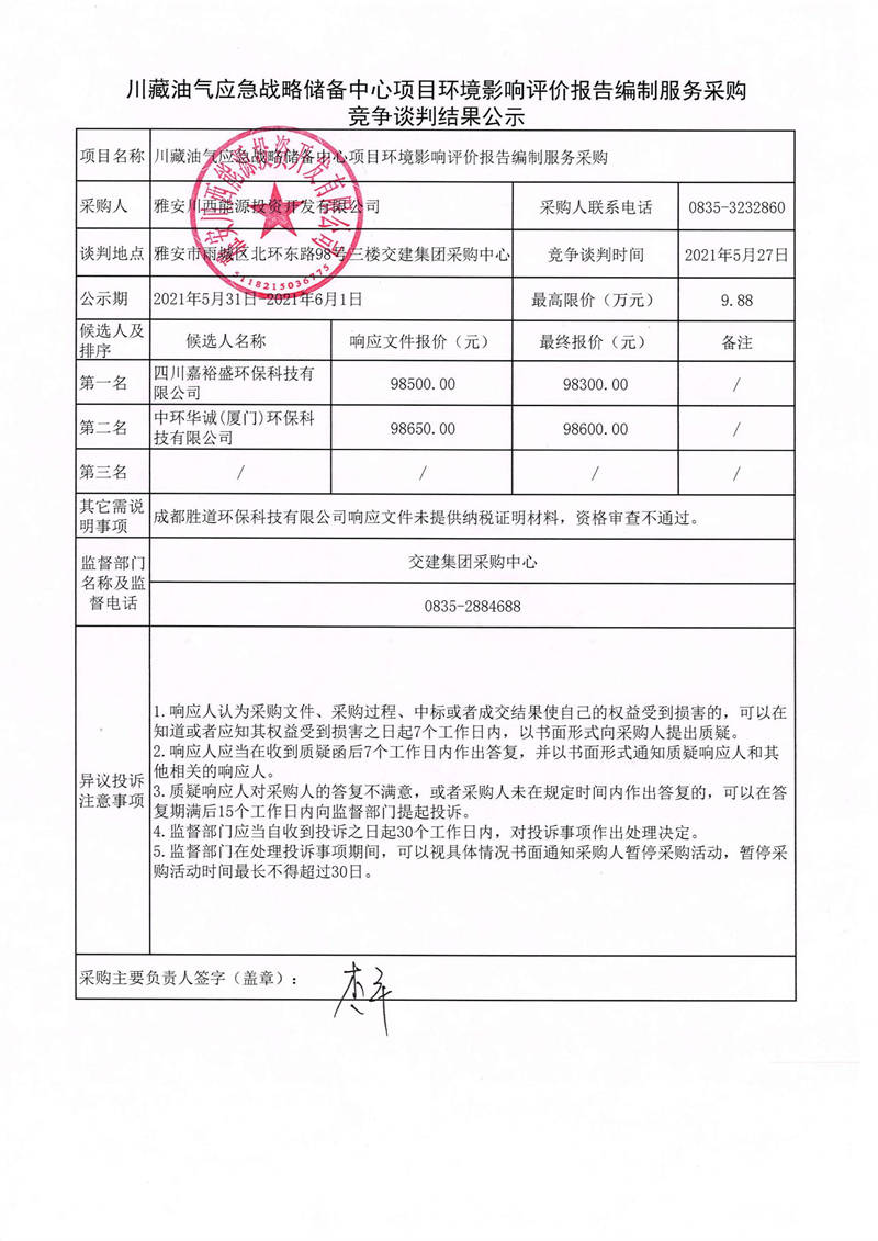 雅安川西能源投資開(kāi)發(fā)有限公司川藏油氣應(yīng)急戰(zhàn)略儲(chǔ)備中心項(xiàng)目環(huán)境影響評(píng)價(jià)報(bào)告編制服務(wù)采購(gòu)競(jìng)爭(zhēng)性談判結(jié)果公示