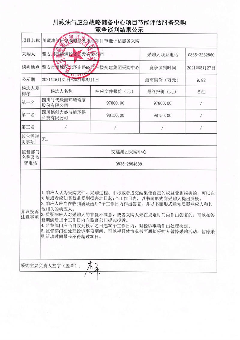 雅安川西能源投資開發(fā)有限公司川藏油氣應(yīng)急戰(zhàn)略儲(chǔ)備中心項(xiàng)目節(jié)能評(píng)估服務(wù)采購競爭談判結(jié)果公示