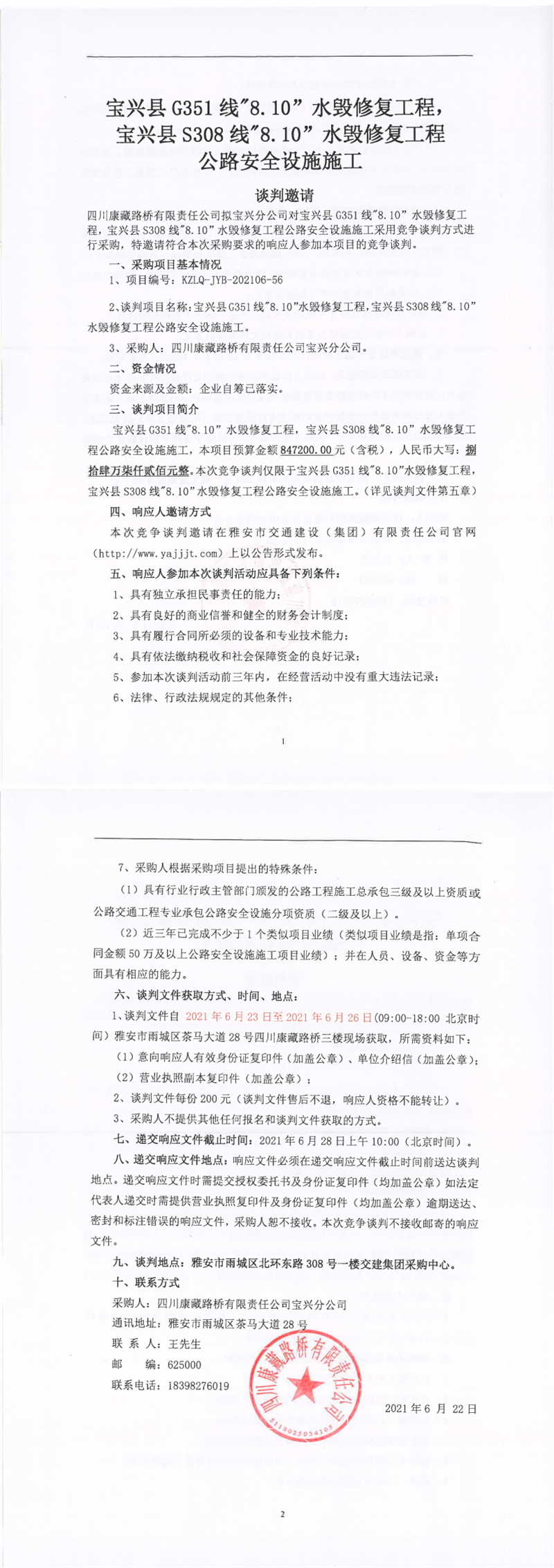 寶興縣G351線“8.10”水毀修復工程,寶興縣S308線“8.10”水毀修復工程公路安全設施施工競爭談判公告