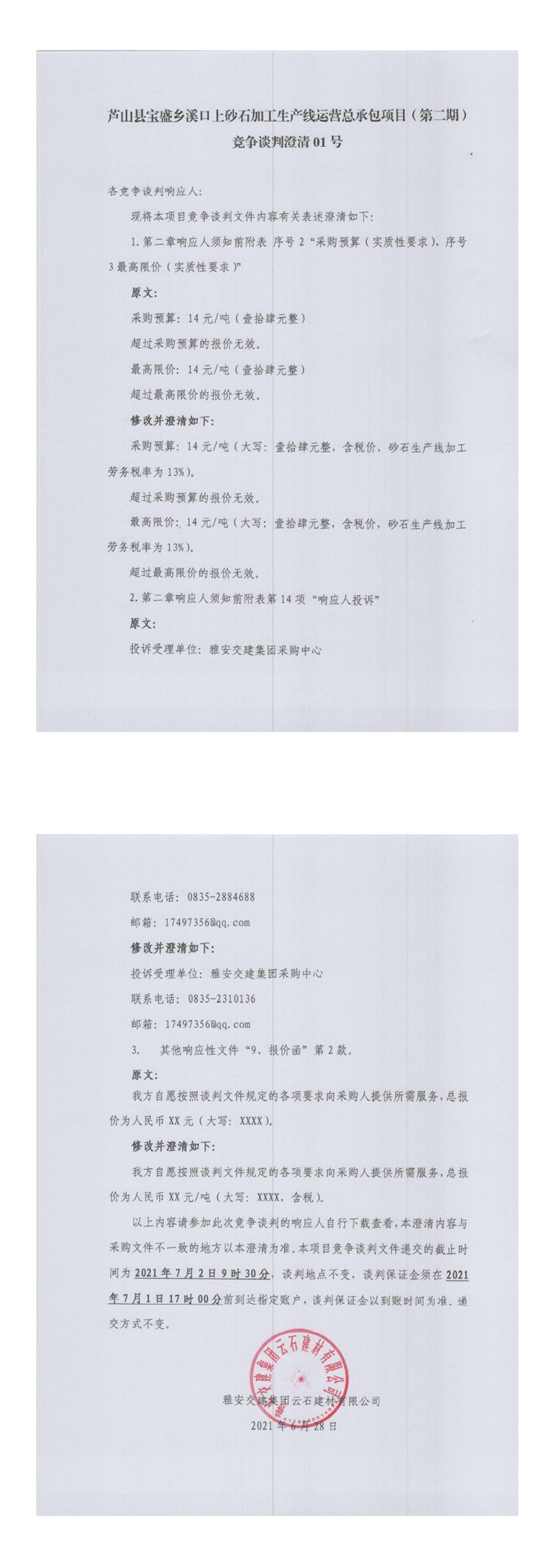 雅安交建集團云石建材有限公司蘆山縣寶盛鄉(xiāng)溪口上砂石加工生產線運營總承包項目(第二期)競爭談判澄清公告