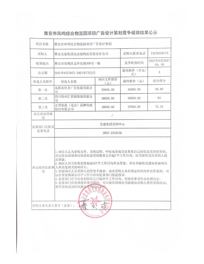 雅安交建集團無水港物流有限責(zé)任公司雅安市鳳鳴綜合物流園項目廣告設(shè)計策劃競爭磋商結(jié)果公示