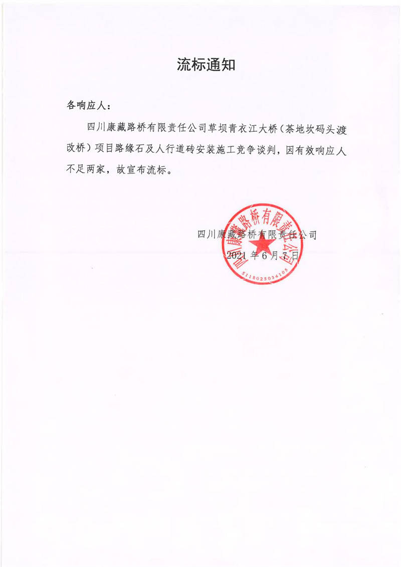 四川康藏路橋有限責(zé)任公司草壩青衣江大橋(茶地坎碼頭渡改橋)項(xiàng)目路緣石及人行道磚安裝施工競爭談判流標(biāo)通知