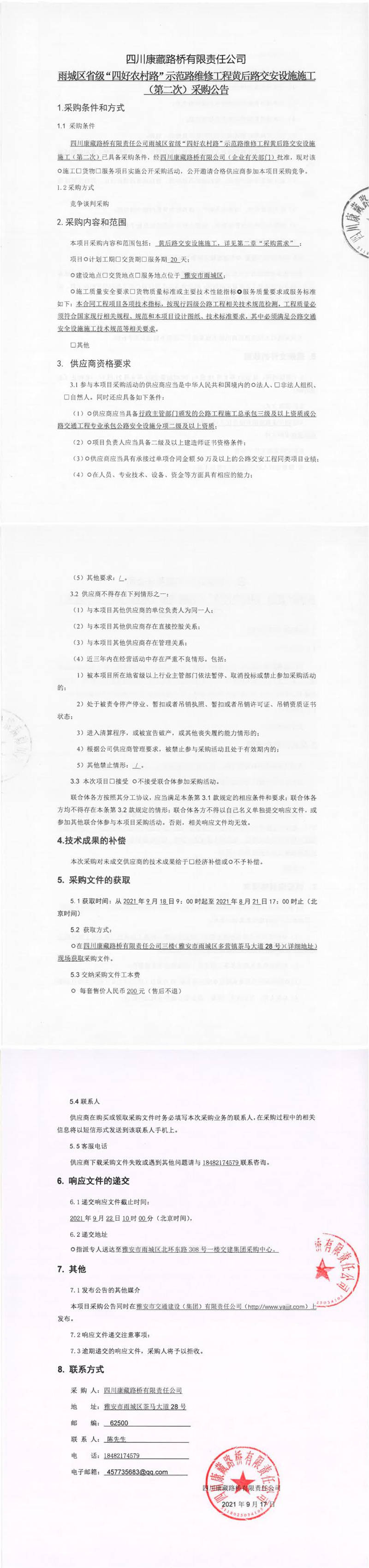 四川康藏路橋有限責任公司雨城區(qū)省級“四好農(nóng)村路”示范路維修工程黃后路交安設施施工(第二次)采購公告