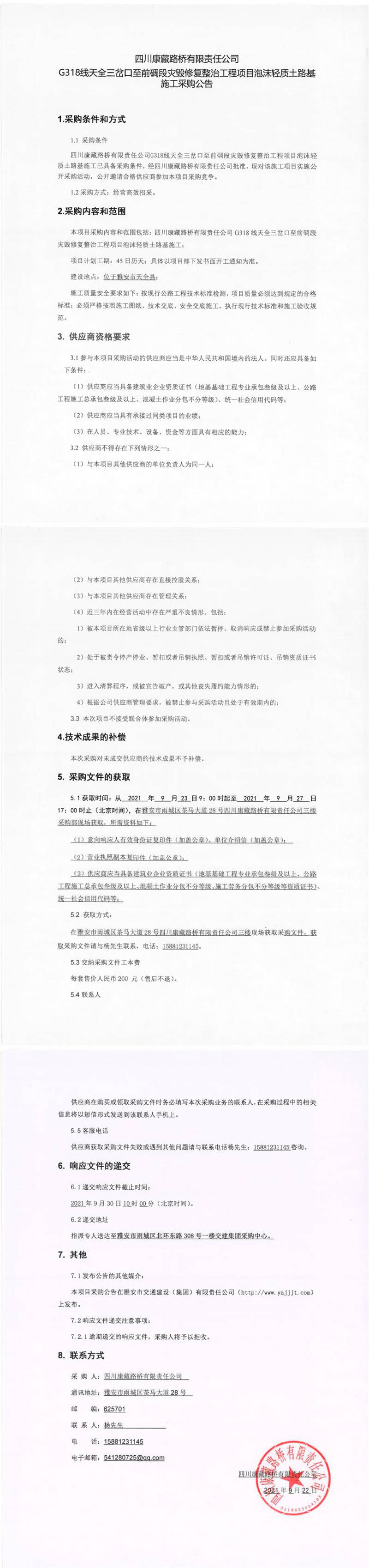 四川康藏路橋有限責任公司G318線天全三岔口至前碉段災毀修復整治工程項目泡沫輕質土路基施工采購公告