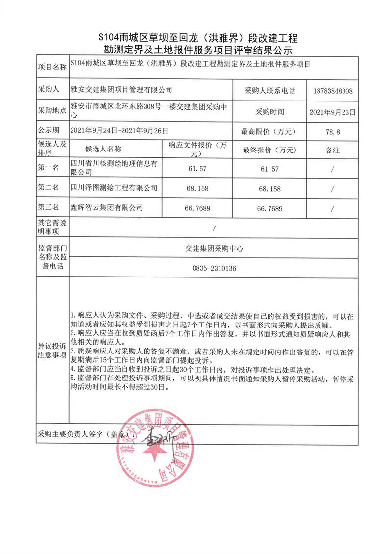 雅安交建集團(tuán)項(xiàng)目管理有限公司S104雨城區(qū)草壩至回龍(洪雅界)段改建工程勘測定界及土地報件服務(wù)項(xiàng)目評審結(jié)果公示