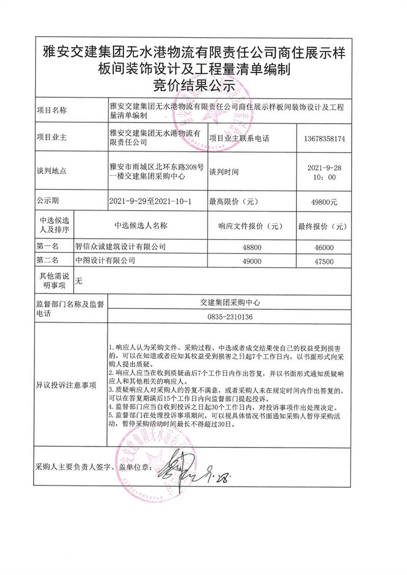 雅安交建集團(tuán)無水港物流有限責(zé)任公司商住展示樣板間裝飾設(shè)計(jì)及工程量清單編制競價結(jié)果公示